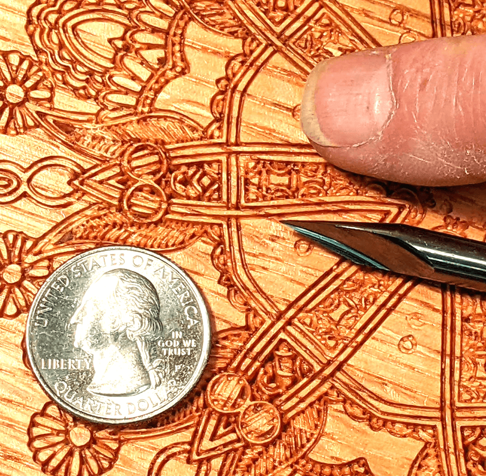 The Blade is designed with a knife edge all the way to the point! Not only can you carve to 0.005" detail, this CNC router bit also cuts the wood, leaving a mind-blowing smooth cut. It is a true carving bit!