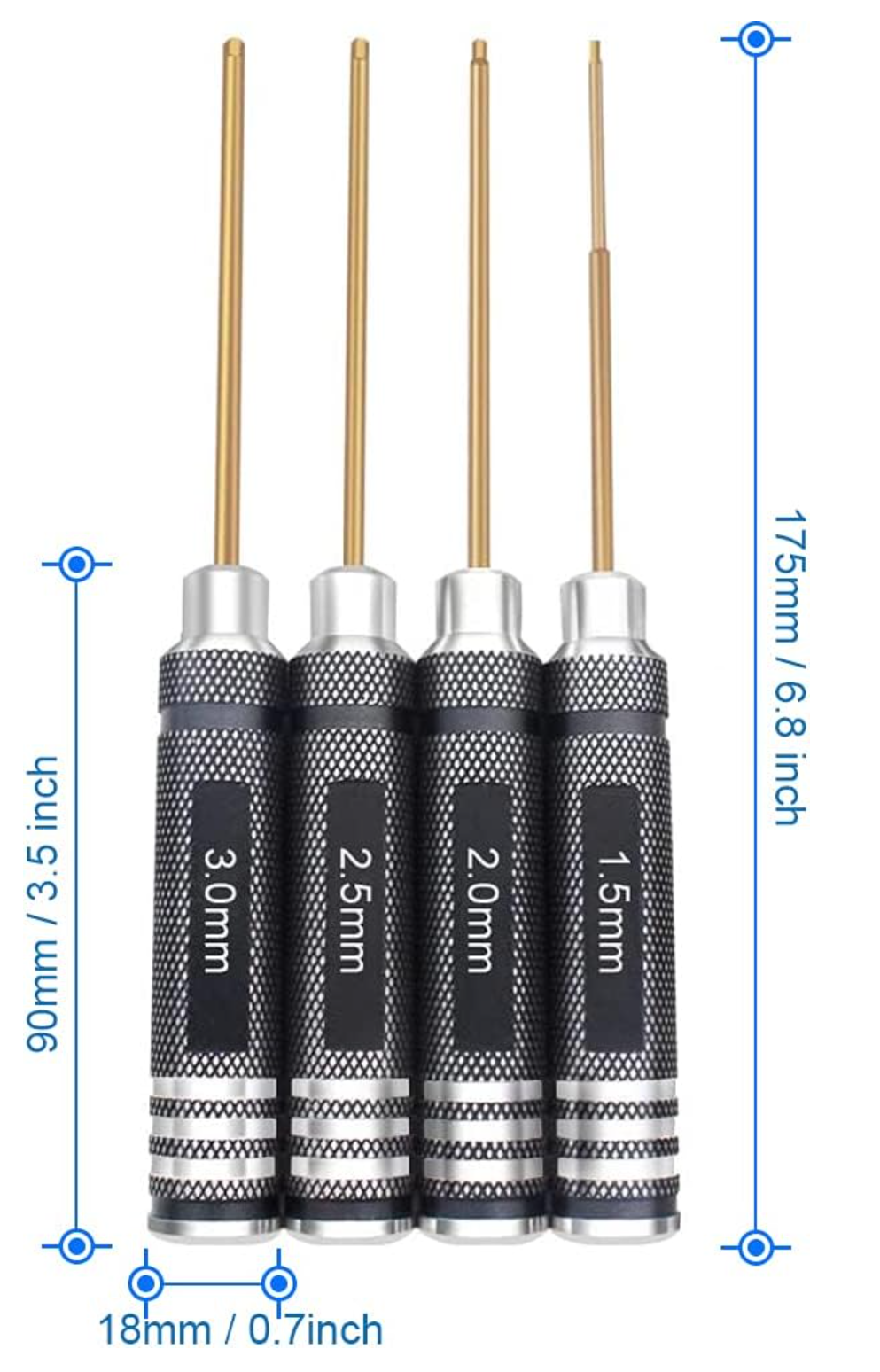 Set Contains: 4 Allen Hex Screwdrivers in 4 different sizes. The Aluminum handle with soft non-slip surface has a length of: 90mm/3.5inch and a Diameter of: 18mm. Total length: 175mm 1 x 1.5 mm, 1x 2.0mm, 1x 2.5mm, 1x 3mm. Each Handle is Marked with a Clear Size Inscription for Easy Identification and Use.